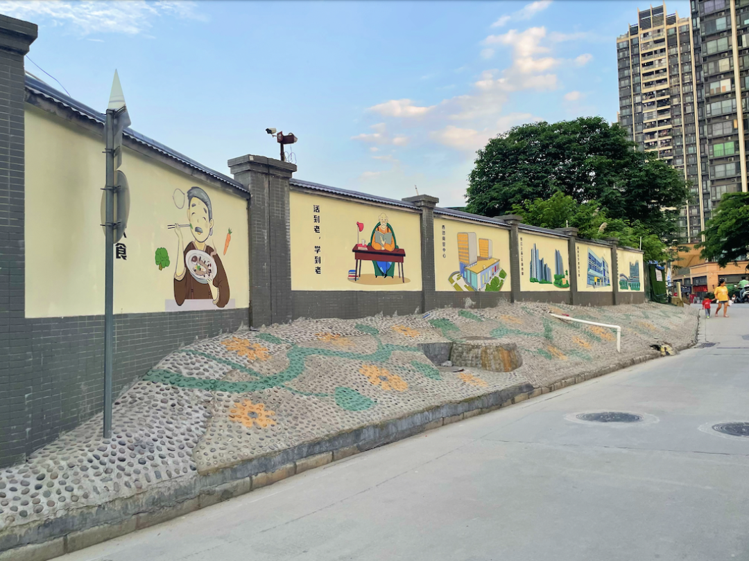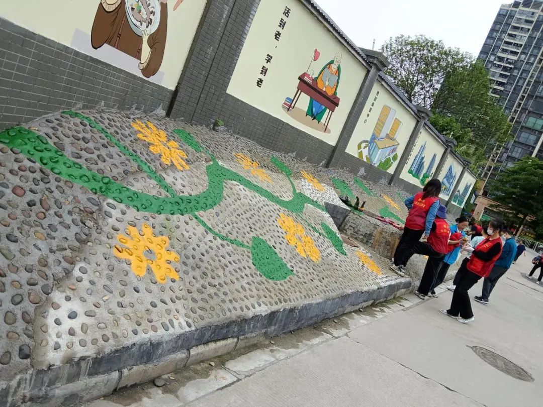 在现场,小e看到,经过涂鸦后的斜立面变成了一道绘有美丽图案的墙体。黄绿搭配的色彩勾画出花朵、叶子和藤蔓的造型,富有童趣,传递出健康向上的生活态度,为孩子们的上学之路增添了色彩与活力。