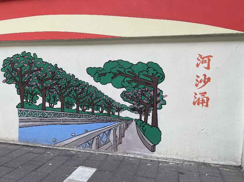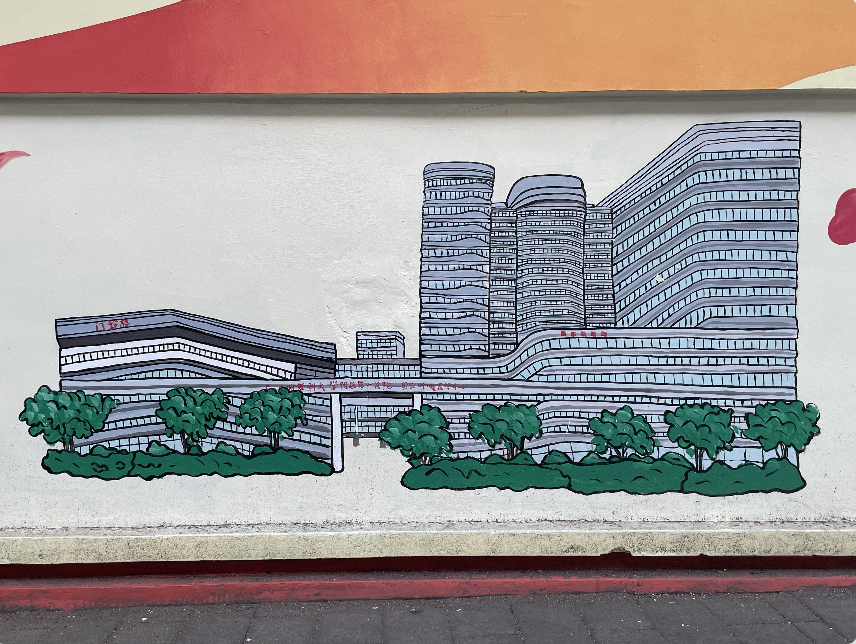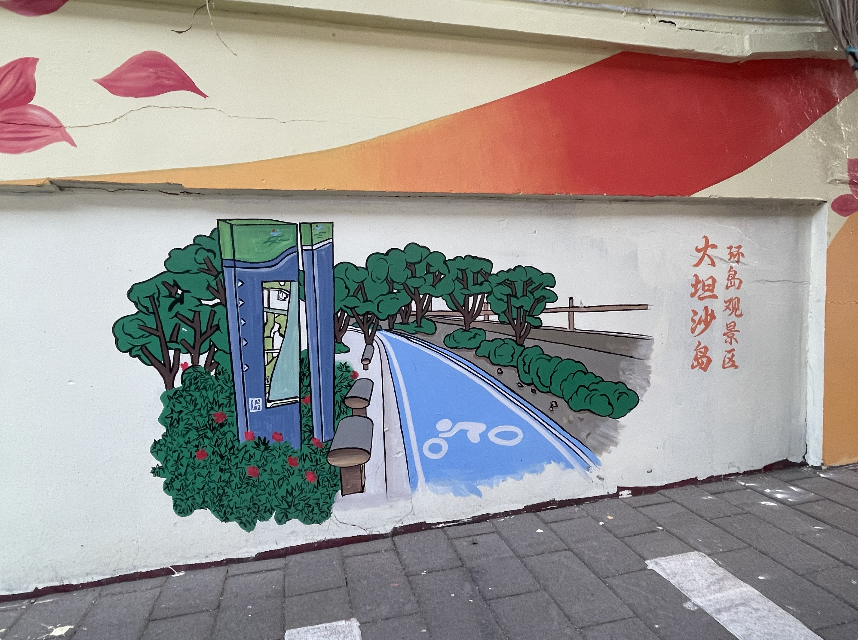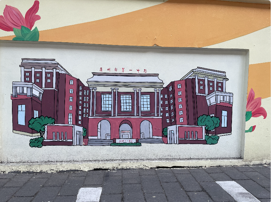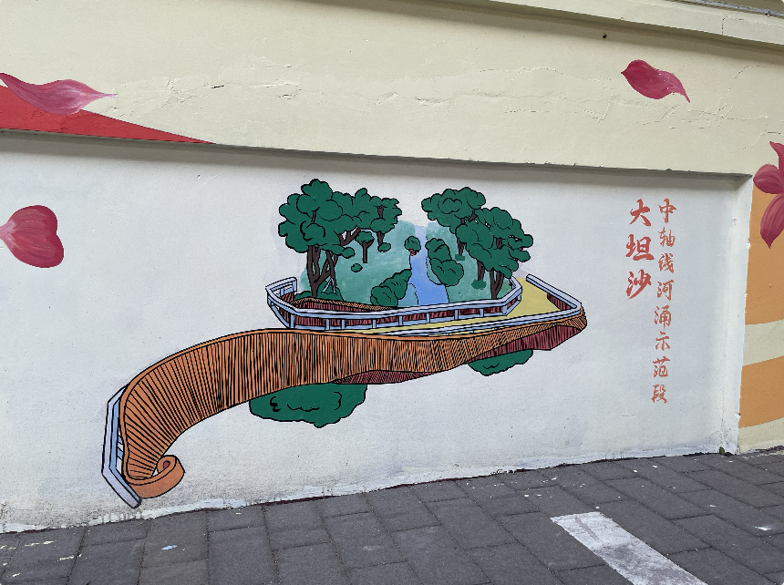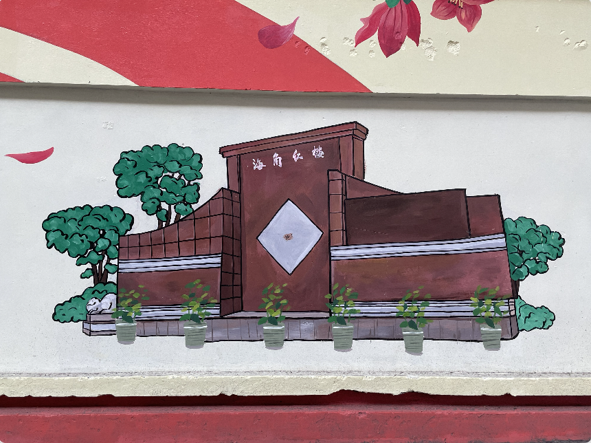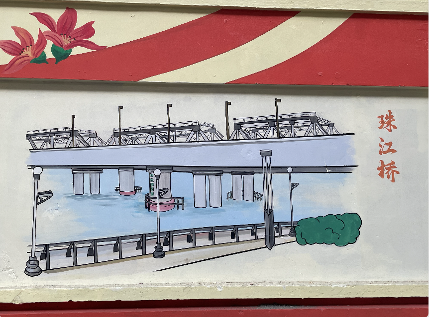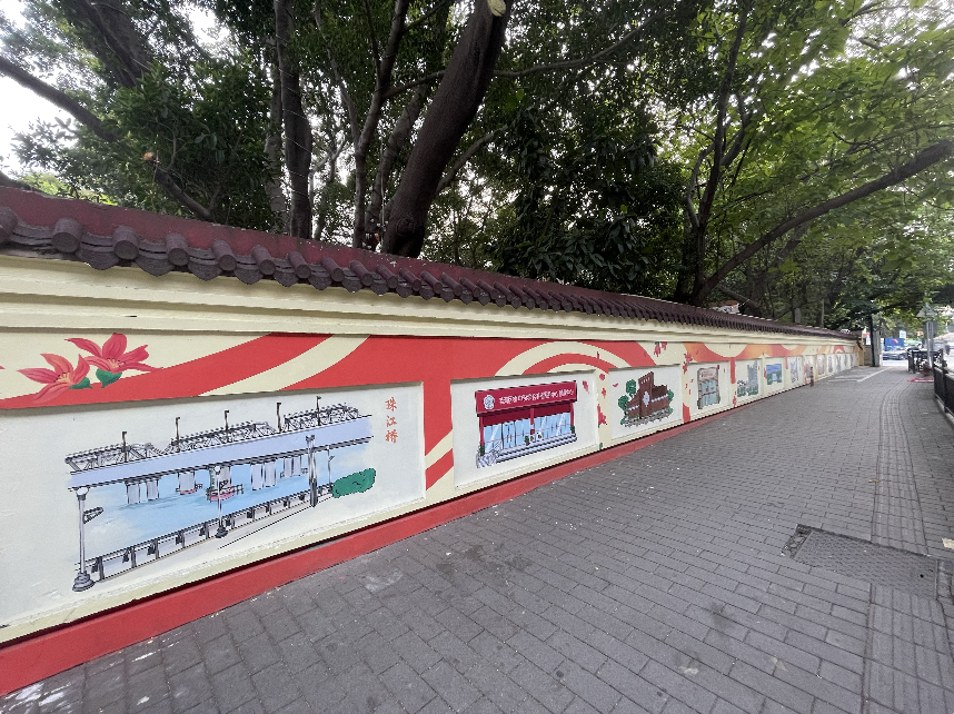 墙绘主要以黄色基调为主,黄色的墙面配合海角红楼独特的红色屋檐,别有一番韵味。此外,每张墙绘图上的内容还特意设计了大坦沙岛具有代表性的地标,包括环岛景观区、中轴线河涌景观示范段、河沙涌、桥中街道“三中心”、广州市第一中学、广州呼吸中心、海角红楼、珠江桥等,格外醒目、吸睛。