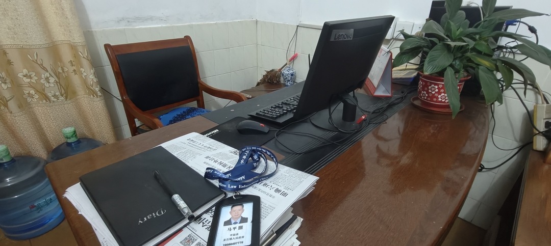 昨日晚上,记者来到了马平生前的工作地——东石镇综合行政执法办公室,只见马平办公室里满地泥浆。显然,这里也曾遭遇洪水淹浸。记者现场看到,马平的办公桌上还放着一本他的下乡记录笔记本和一张工作牌。其中,笔记本最近一次时间是马平生前一天记录镇里召开“百千万工程”的会议内容。