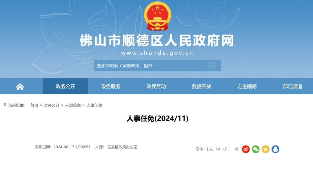 近日,佛山市顺德区政府官网公布了人事任免(2024/11)。