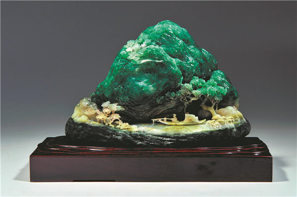 A jade carving featuring a boat on a river against a mountain [Photo provided to China Daily]