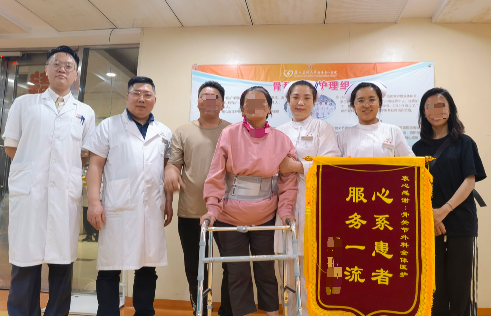 出院时,纪阿姨在助行器的帮助下已经能站起来了。她和家人为广医一院医护团队送上锦旗表达谢意。