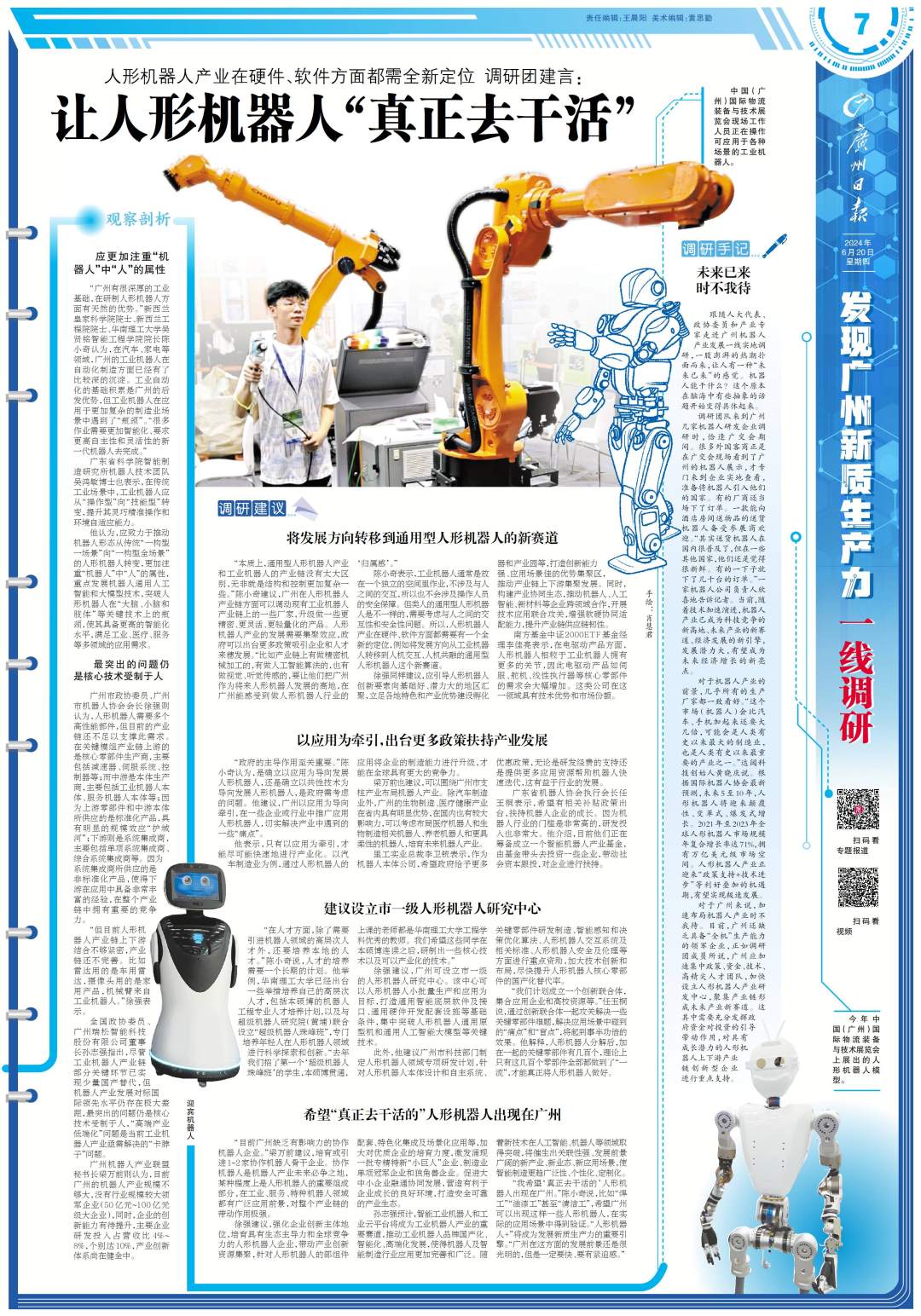 “我希望‘真正去干活的’人形机器人出现在广州。”陈小奇说,比如“焊工”“油漆工”甚至“清洁工”,希望广州可以出现这样一些人形机器人,在实际的应用场景中得到验证。“人形机器人+”将成为发展新质生产力的重要引擎。“广州在这方面的发展前景还是很光明的,但是一定要快、要有紧迫感。”