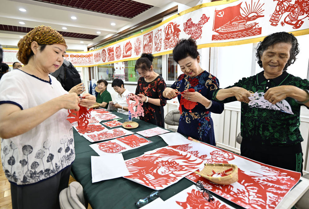 6月19日,长城花园社区居民在社区“才艺堂”制作剪纸。