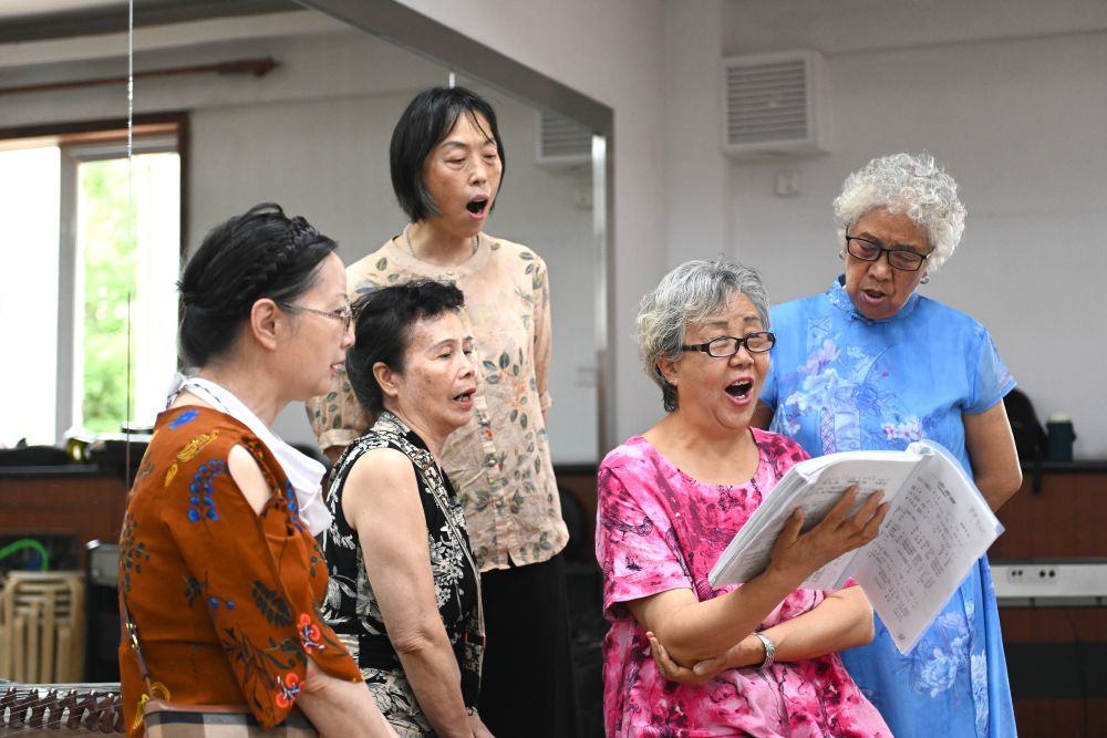 6月20日,长城花园社区居民在活动室排练节目。