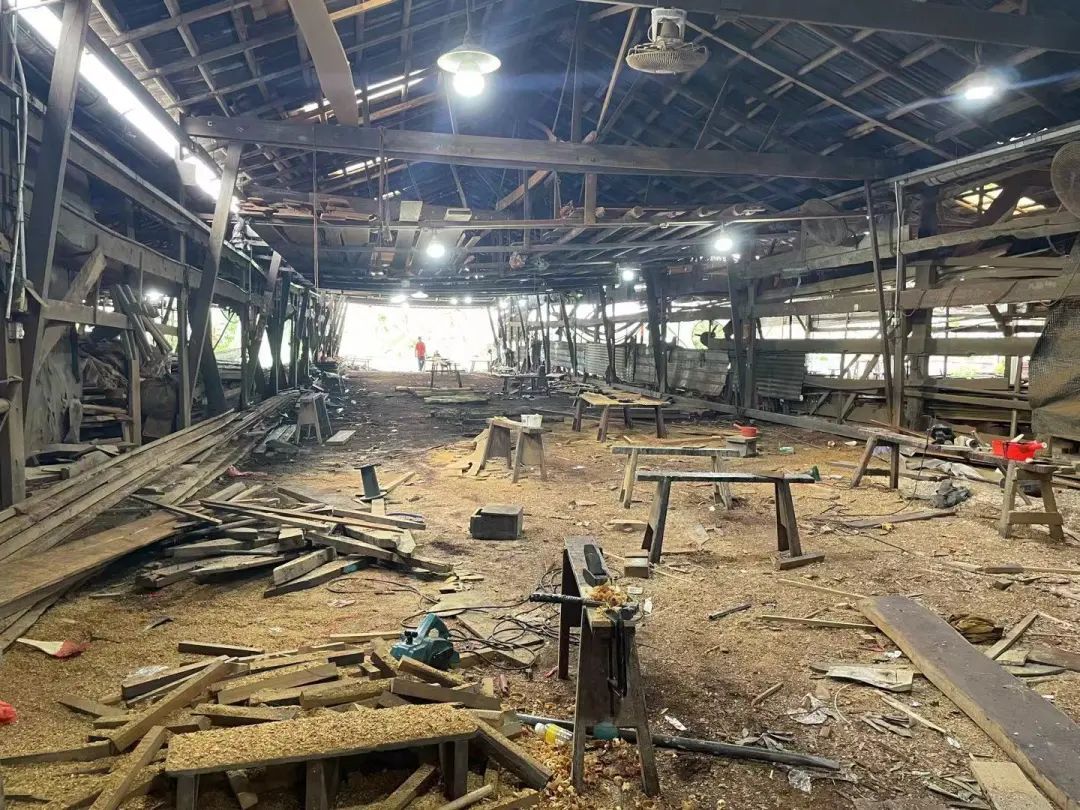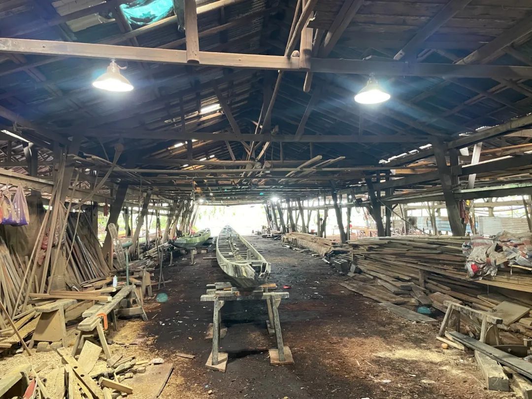 现场工人们紧张忙碌着各道龙舟制作工序。