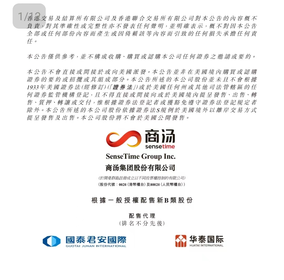 6月21日,商汤科技在港交所发布公告,根据一般授权配售新B类股份。在香港联交所交易时段前,配售1,673,446,000股配售股份,每股配售价为1.20港元。该价格相较于6月20日收盘价每股1.32港元折让约9.1%,相较于前五个交易日的平均收盘价每股1.37港元折让约12.2%。