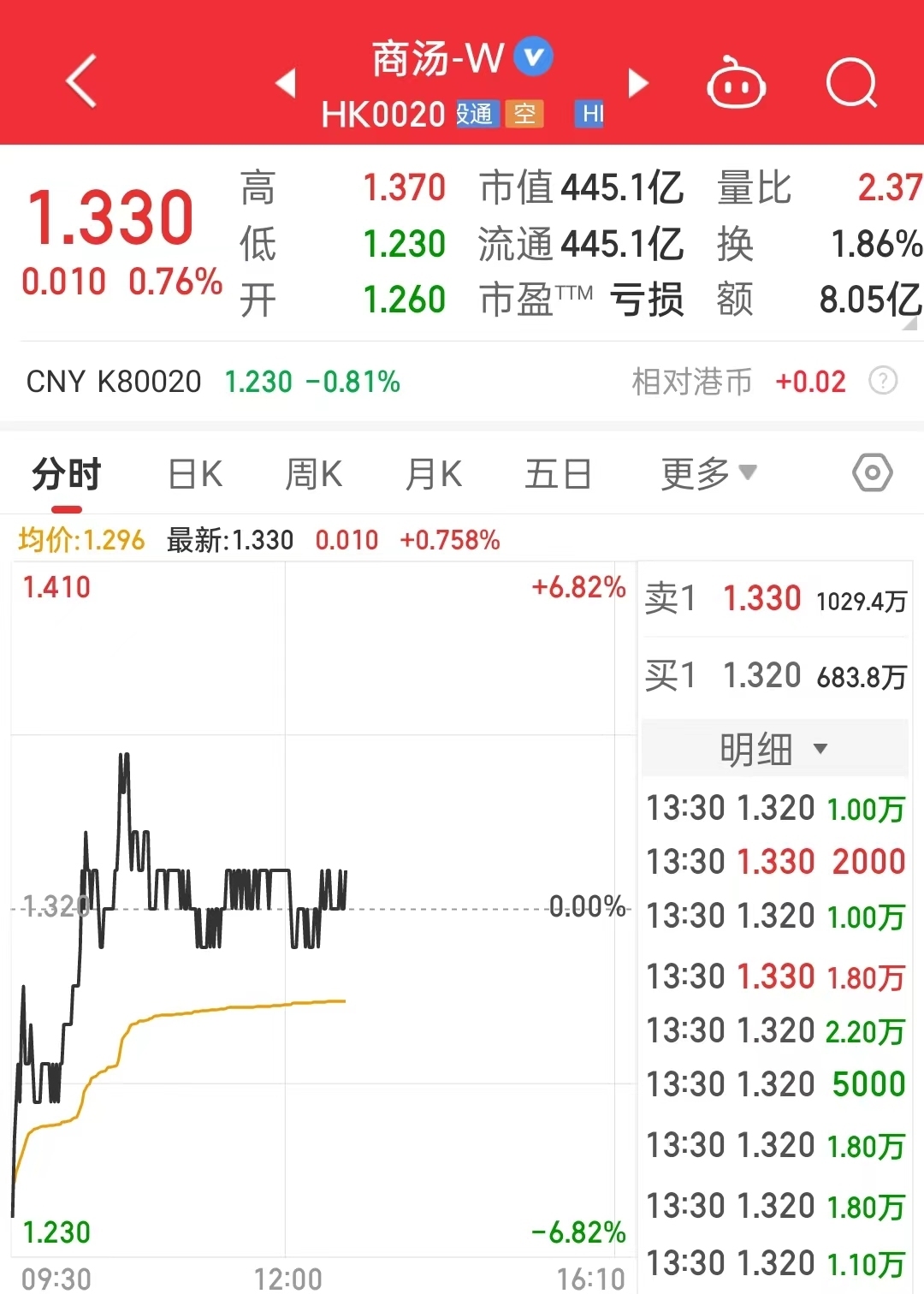 截至21日上午收盘,恒生指数下降1.71%,而商汤科技股价逆市上涨,达到每股1.33港元,较昨日收盘价上涨0.76%。