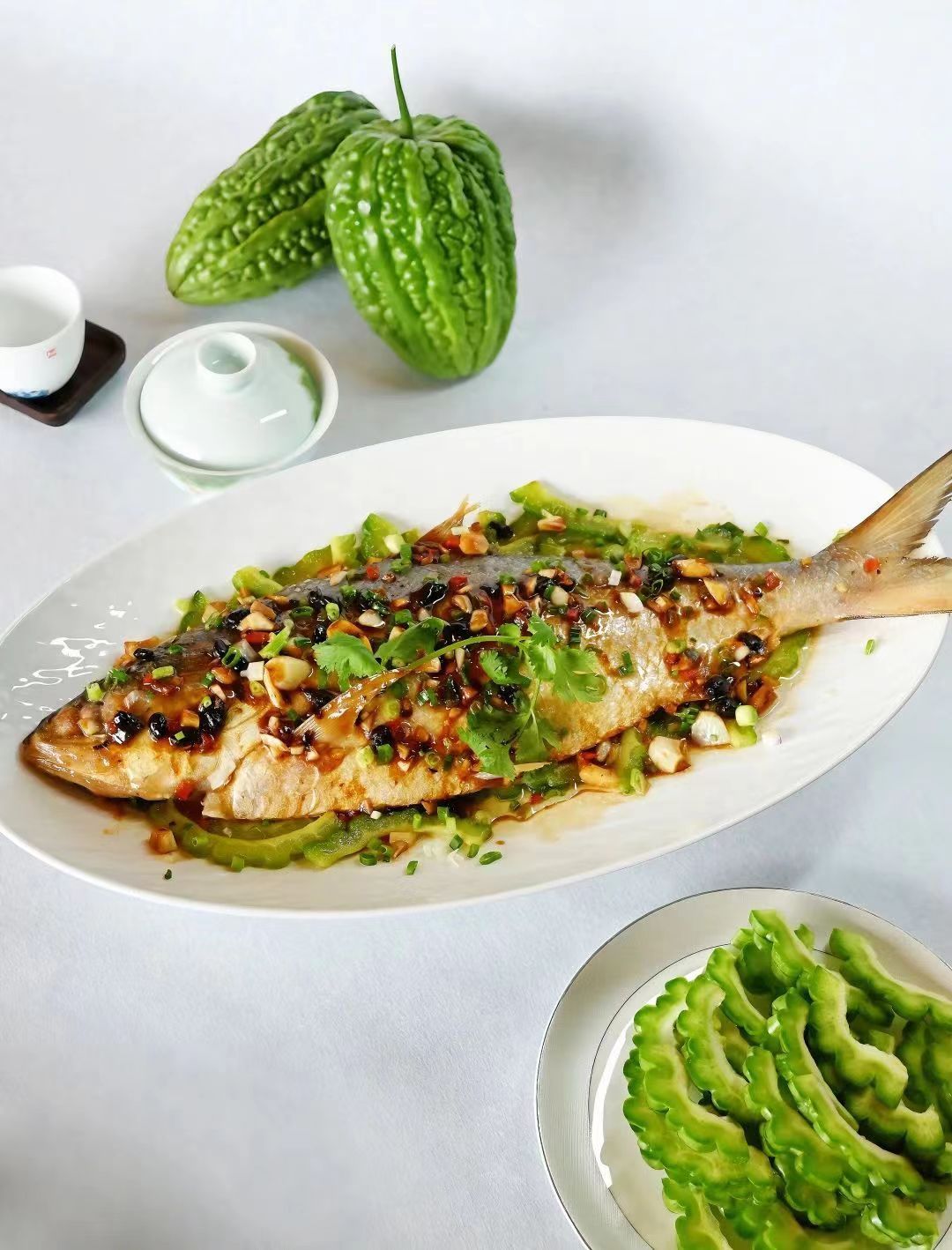 “夏至吃苦,胜过进补”。许多味苦的菜都含有丰富的维生素、胡萝卜素等,有消暑保健的作用。杜阮凉瓜是广东江门的特色瓜果,温师傅说,相较于其他苦瓜,它的苦味更淡,口感也更加爽脆。“很多人会把杜阮凉瓜切得很薄,泡一下冰水,像吃顺德鱼生一样吃,因为它没什么苦味,比较清甜。”“春边秋鲤夏三黎”,夏季也是吃三黎鱼的季节。三黎鱼又称鲥鱼,味鲜肉细,可在两面煎熟后和切成片的苦瓜焖一会儿,做成滋味咸鲜的鲥鱼焖苦瓜。