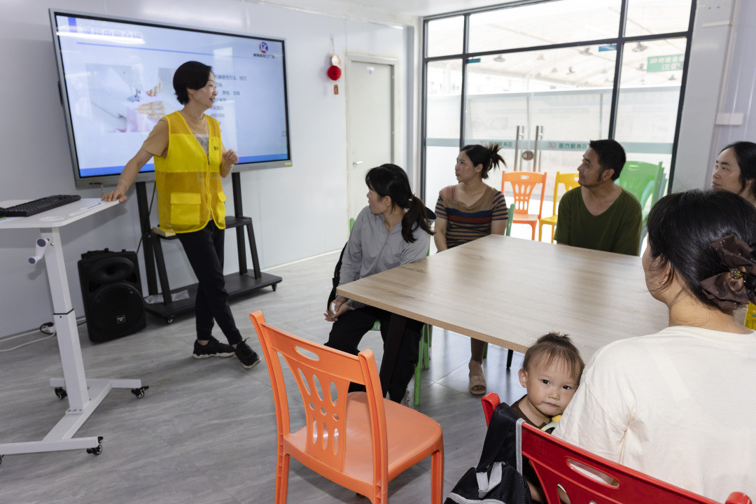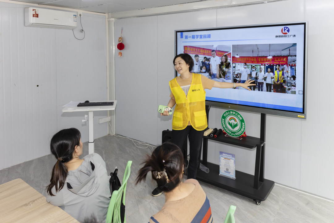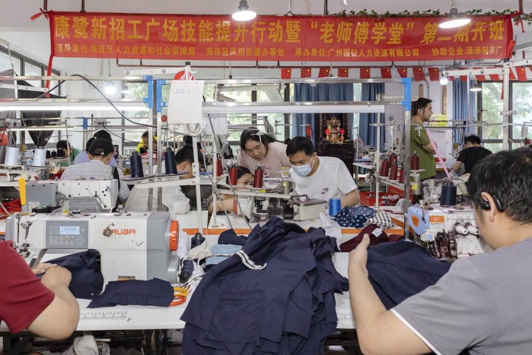 有着20年制衣从业经验的刘永群师傅作为导师,在招工广场附近的涵涵制衣厂内免费对10名零基础的务工人员进行服装加工技能培训。记者看到,前来报名的学员既有对制衣感兴趣的爱好者,也有在家带娃的宝妈。
