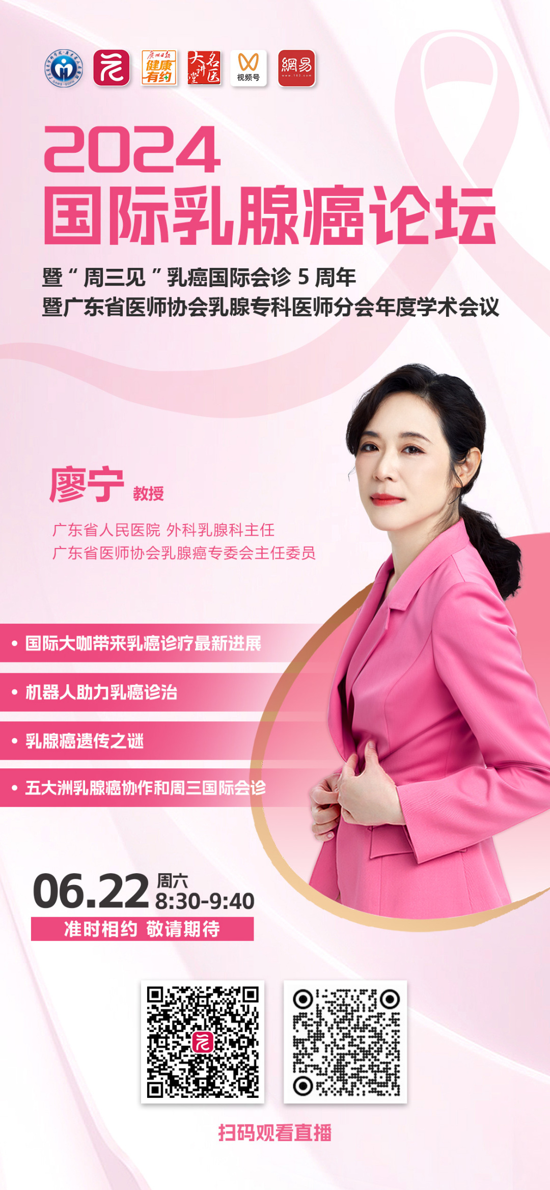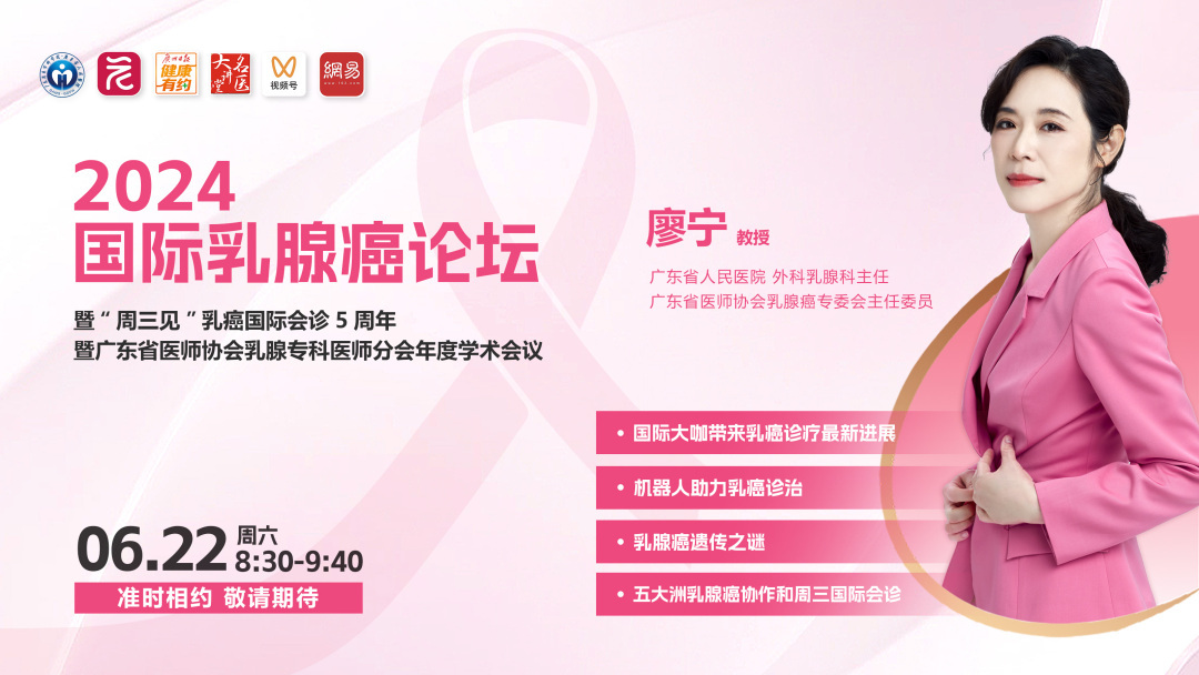 机器人辅助下如何更精准地切除乳腺癌?乳腺癌疫苗“有戏”吗?乳腺癌转移后,救治机会有多大?在破解“乳腺癌遗传之谜”方面,以广东省人民医院为代表的中国团队有哪些新进展?6月22日(周六)8:30-9:40,新当选的广东省医师协会乳腺专科医师分会主委、广东省人民医院外科乳腺科主任廖宁教授将携手广州日报健康有约“名医大讲堂微课”,为普通观众解读这场高规格乳腺癌学术会议带来的真知灼见。