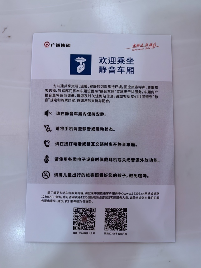 “静音车厢”统一设置在3号车厢,客室两端墙壁显眼位置、客室端门均粘贴有“静音车厢”标识,同时,在每个座椅后网兜内均放置有一张“静音车厢”服务提示卡。