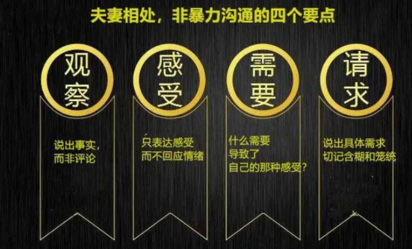 除了心理咨询师的意见,夫妻之间的沟通模式还可以怎样优化?美国威斯康星大学临床心理学博士马歇尔·卢森堡博士在著作《非暴力沟通》一书里,教我们通过非暴力沟通,让冲突迎刃而解。夫妻之间的非暴力沟通包括4要素:观察、感受、需要、请求。