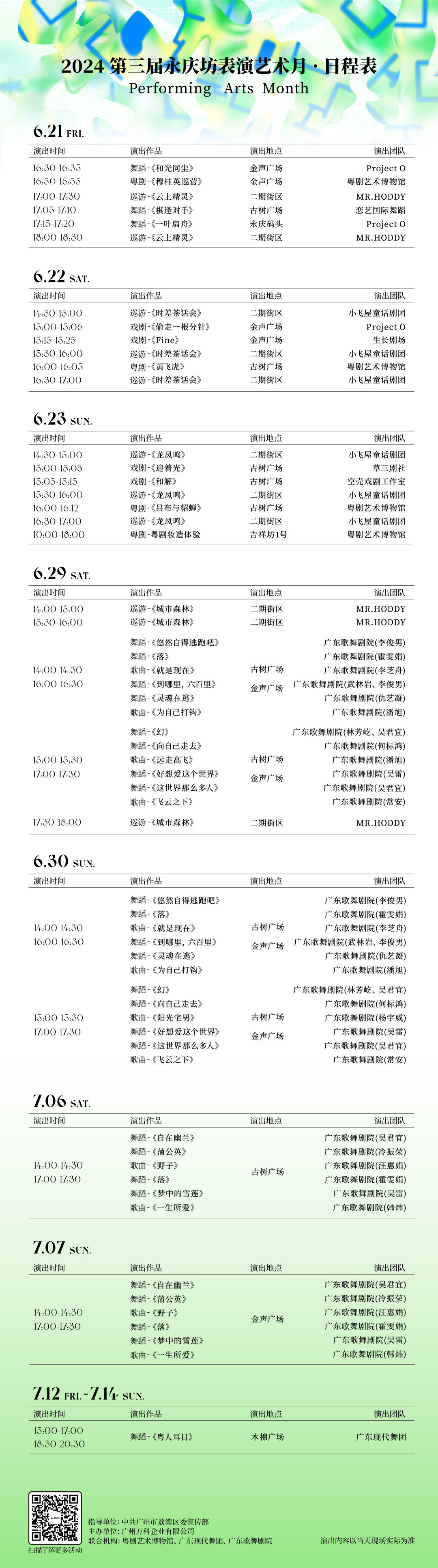随着第三届永庆坊表演艺术月的开幕,即日起至7月14日,全国各地艺术团队汇聚永庆坊街区,佳作云集,免费呈现。现代舞、粤剧、戏剧及装置等多种艺术形式汇聚街区,粤剧艺术博物馆、广东现代舞团、广东歌舞剧院等艺术文化机构带领市民共同进入沉浸式的艺术体验之旅。