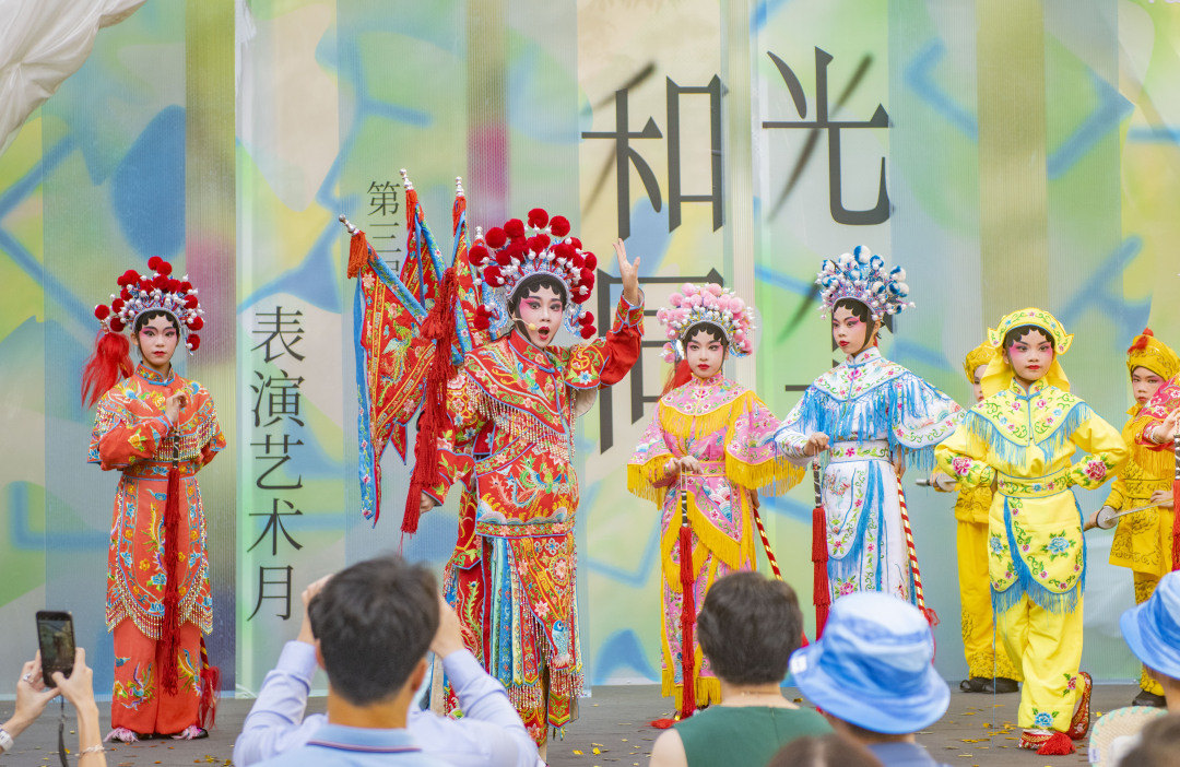 开幕仪式上,在金声广场的开放式舞台,现代舞《和光同尘》与传统粤剧曲目《穆桂英巡营》同台表演,现代与传统的碰撞吸引眼球。在古树广场、永庆码头,快闪式的现代舞《棋逢对手》《一叶扁舟》或热情或温情的表演,吸引市民游客驻足欣赏。