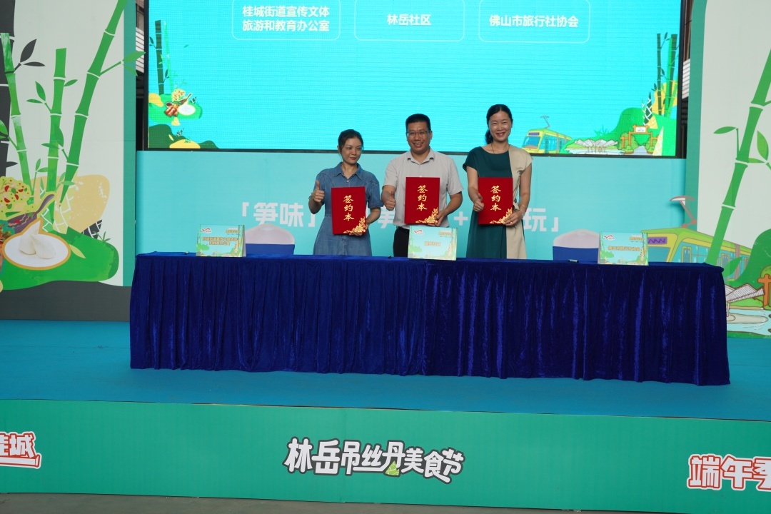 在现场还有一个细节值得关注。本次吊丝丹笋美食节吸引了近40家旅行社负责人的关注和参与。佛山市旅行社协会与桂城街道宣传文体办、林岳社区签订了三方合作协议,强化林岳吊丝丹在旅游市场上的影响力。 “第一次吃林岳吊丝丹笋,很清甜爽口,很不错,各种做法很有特色,值得推荐。”佛山浩兴国旅总经理赵新英表示,“现在人们追求健康饮食,笋做出了本来的味道,我们想去广州推广,让大家都来尝试一下。”