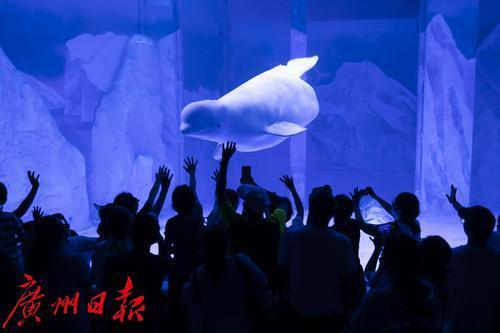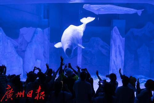 白鲸游近与观众打招呼,观众兴奋地举手欢呼回应。
