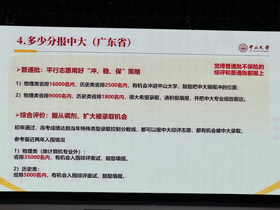 广东考生多少分可以报中大?邹丹建议,物理类省排名16000名以内,历史类省排名2500名以内,有机会“冲”进中山大学,鼓励把中大填报在“冲”的位置;物理类省排名9000名以内,历史类省排名1800名以内,很大希望录取,建议积极填报,并把中大专业组放前边。