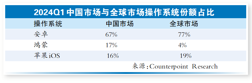 华为内部曾表示,“生态成,则鸿蒙成”。根据惯例,全球所有的操作系统,必须达到16%才能存活下来。今年6月15日,研究机构Counterpoint Research发布的最新数据显示,鸿蒙HarmonyOS在中国市场的份额由2023年一季度的8%上涨至2024年一季度的17%,苹果iOS份额则从20%下降至16%。这也意味着在中国市场,鸿蒙在中国市场首次超越苹果iOS,成为第二大操作系统,而更具意义的是,份额已跨越16%“生死线”, 安卓、鸿蒙、iOS三分天下的态势已定。