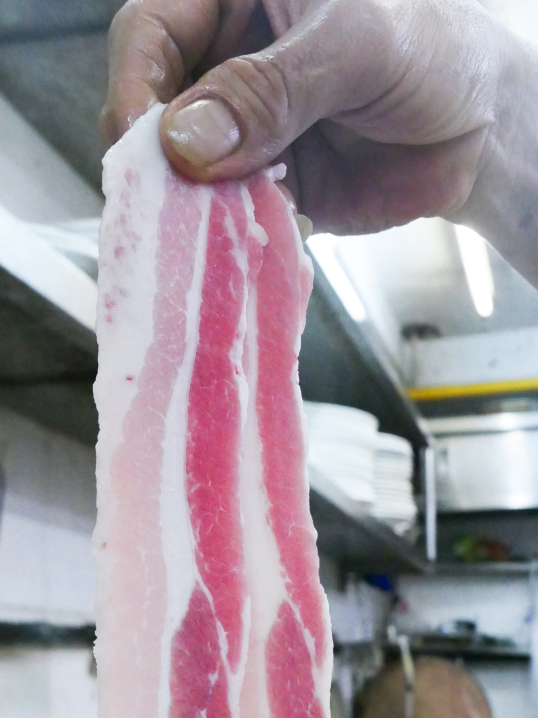 三层肥肉三层瘦肉的新鲜五花肉,是制作南乳肉的最佳比例。“五花肉要冻硬才能切,但不能用机器,否则肉很容易碎,而且要保证每片肉都是直身,不能卷边。”在信记工作了20多年的厨房大佬罗师傅强调,每片五花肉都得切成长约十二三厘米,约为一根牙签的厚度,“按这个规格做出来的南乳肉才能达到咬下去脆,吃起来化口的效果。”