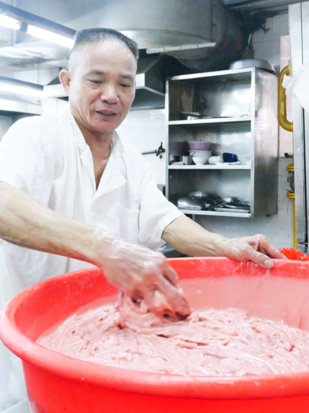 为了让酱汁牢牢裹在每片肉上,师傅需按顺时针方向不断翻拌肉片与酱汁,直至把酱汁捞至起浆。何谓起浆?“就像做布拉肠的粉浆,不能太水汪汪,粉浆滴下时应为线状。”腌制几十斤重的肉片当然费力,但并非只靠蛮力,还需讲求技巧。“如果不停地翻拌,肉片是无法充分吸收水分以及干葱和南乳香味的,所以要不时静置一会。”