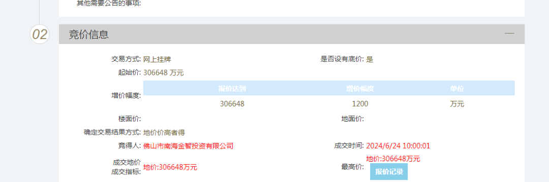 6月24日,佛山市南海区大沥镇黄岐东秀成片征收回迁项目地块(大沥镇黄岐、东秀社区东部、广茂铁路主线以东、广茂铁路支线以北宗地)由 佛山市南海金智投资有限公司竞得,成交总价为306648万元,为南海区今年出让的面积最大、金额最大的住宅地块。按照出让方案,该项目需配建地块内一所24班小学、一所18班幼儿园、约3.7万平方米公园绿地、纵一路、横一路、横二路等周边道路工程,还需配建位于大沥镇灯湖中轴片区的36班灯湖中轴小学,总配建工程造价超5亿元。