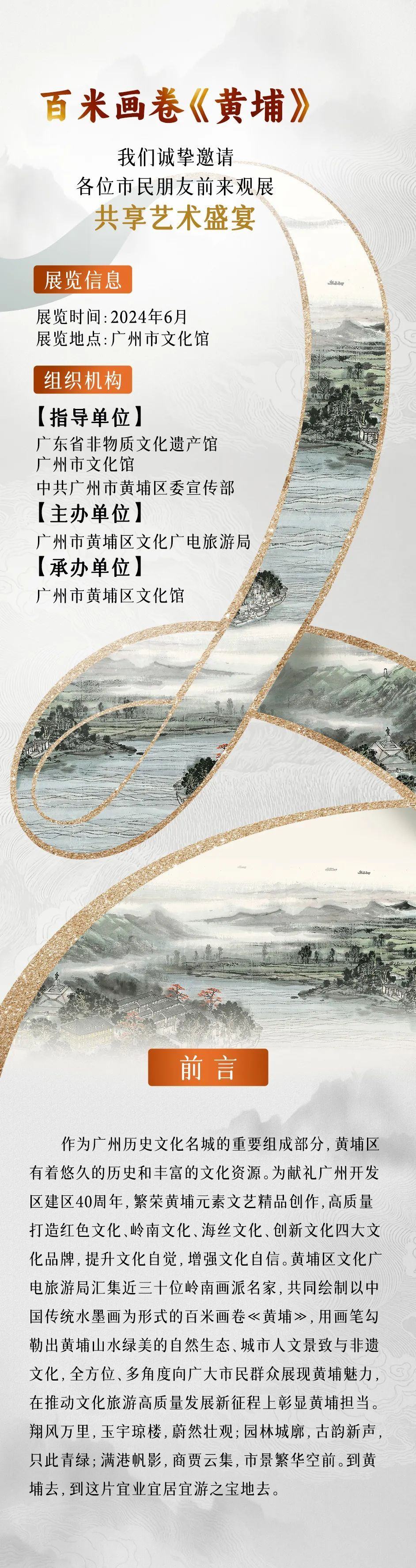 近日,百米长卷《黄埔》在广州市文化馆展出,长卷由黄埔区文化馆组织多位岭南书画名家绘制而成,采用中国传统水墨画的方式,以黄埔区多项非遗等为主题,多角度、多方位地描绘黄埔区悠久而厚重的历史文化底蕴和山水美景。
