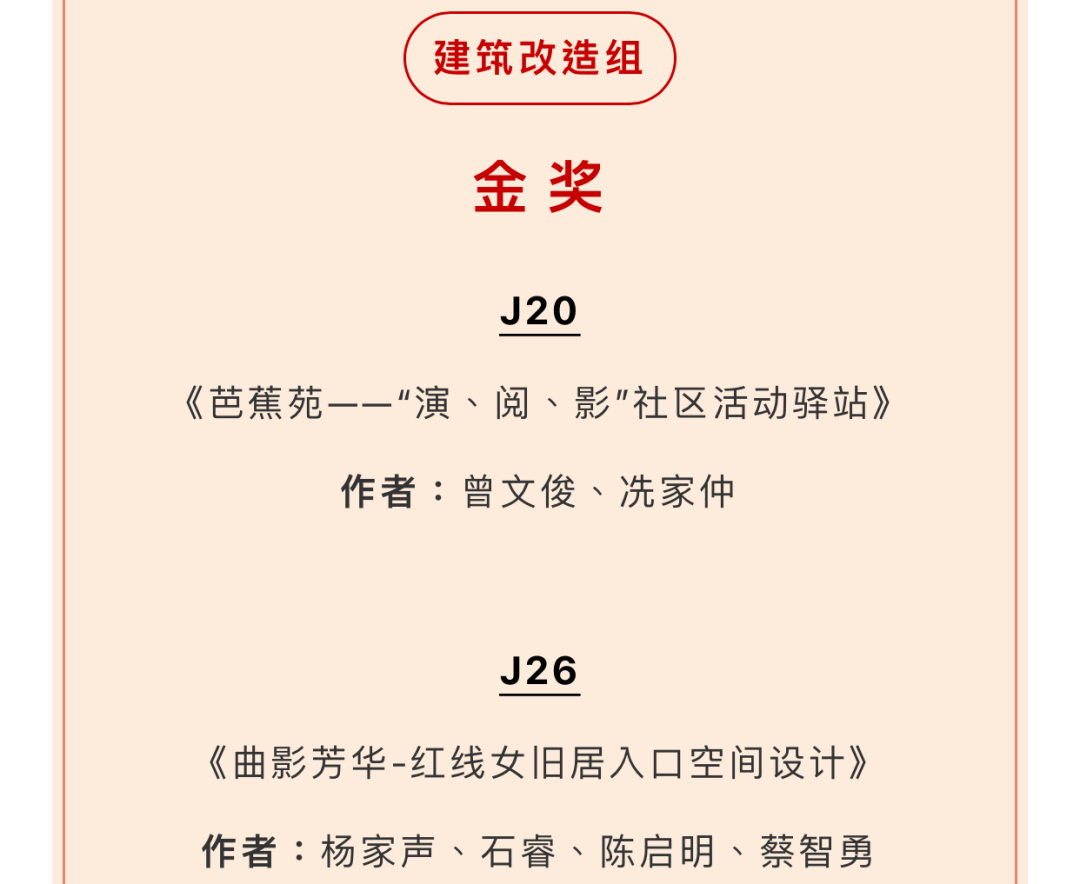本次活动选点覆盖全市各区,共计选取35个老旧小区改造项目,竞赛内容从建筑改造、公共空间活化、社区文化传播创意设计三个方向切入。评审环节采用专家评审与网络投票相结合的方式,从作品专业度、居民喜爱度、方案可实施程度等多方面进行综合评价。最终,每个组别均评选出金奖2名,银奖4名,人气奖3名。