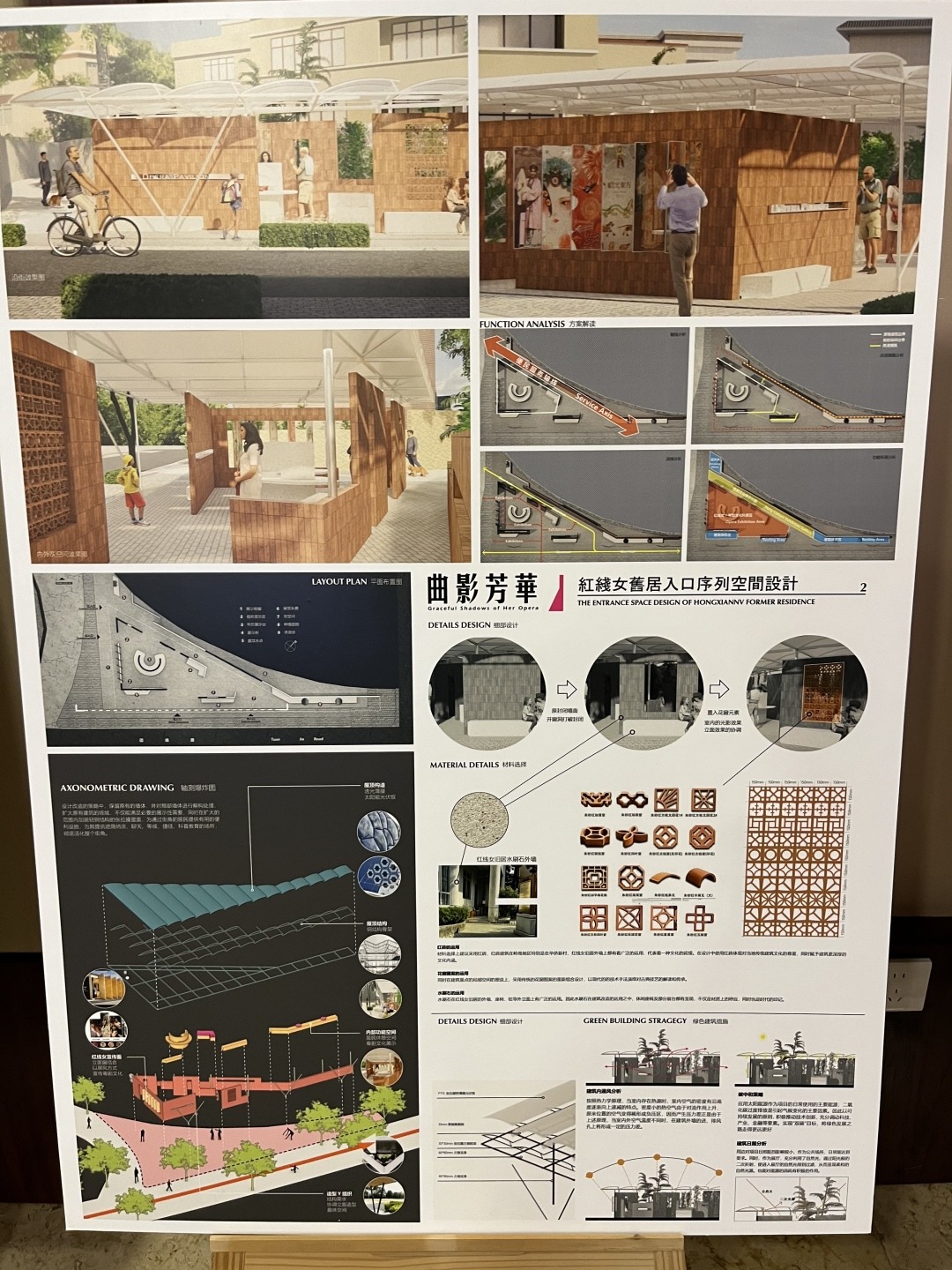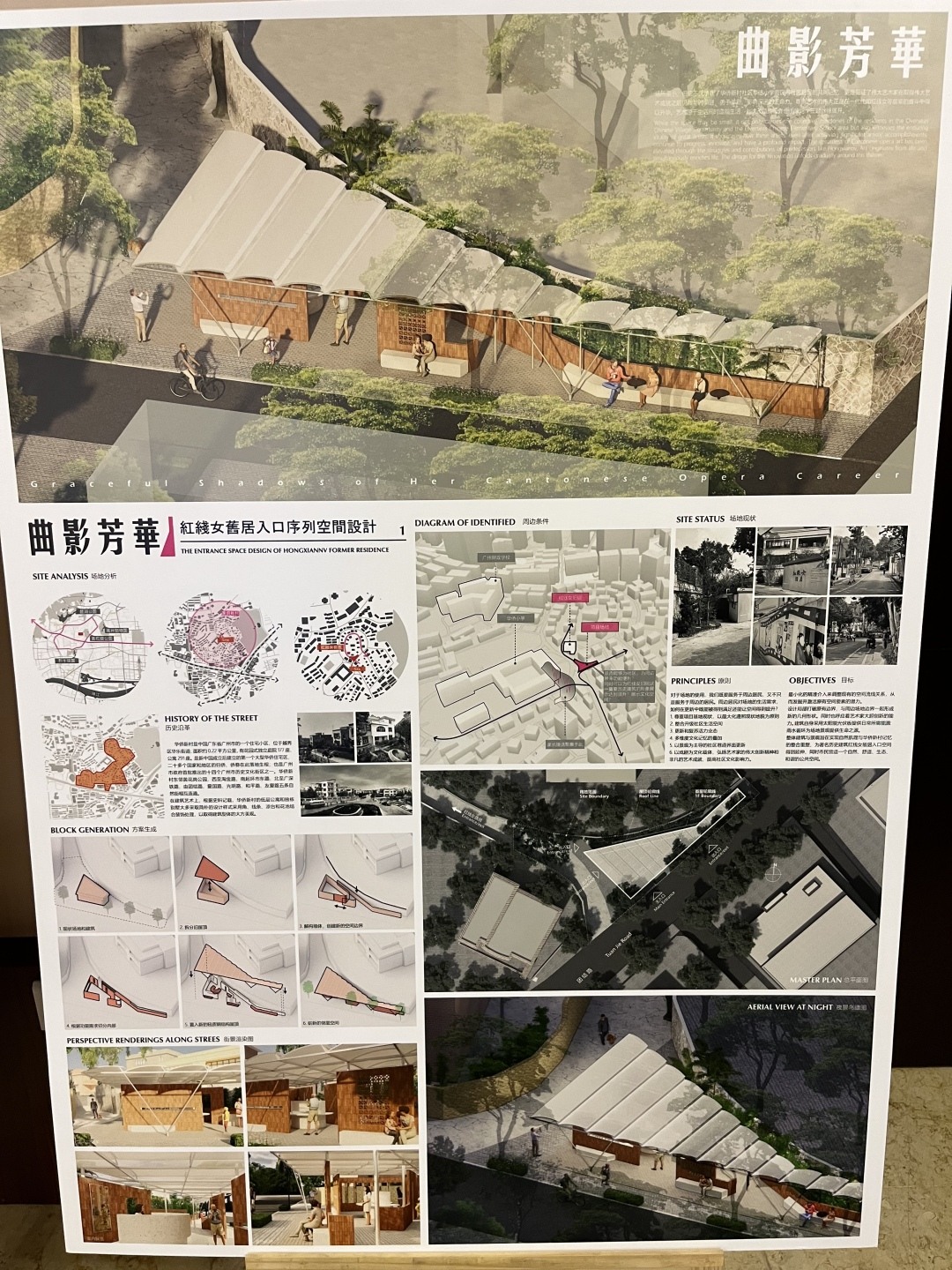 位于华侨新村的红线女旧居门外,拟增设入口空间。设计打破原有边界,形成一个新的几何形象,提升旧居这一历史建筑的可见度。在材料运用上,选取在红线女旧居广泛使用的红砖和水刷石,形成时代的呼应。这一空间将为居民提供遮阴纳凉、聊天、等候、捷径、科普的场所,活化整个街角。在本次大赛中,这个名为《曲影芳华》的设计方案荣获建筑改造组金奖。记者了解到,部分优秀设计有望在接下来的改造中落地实现。