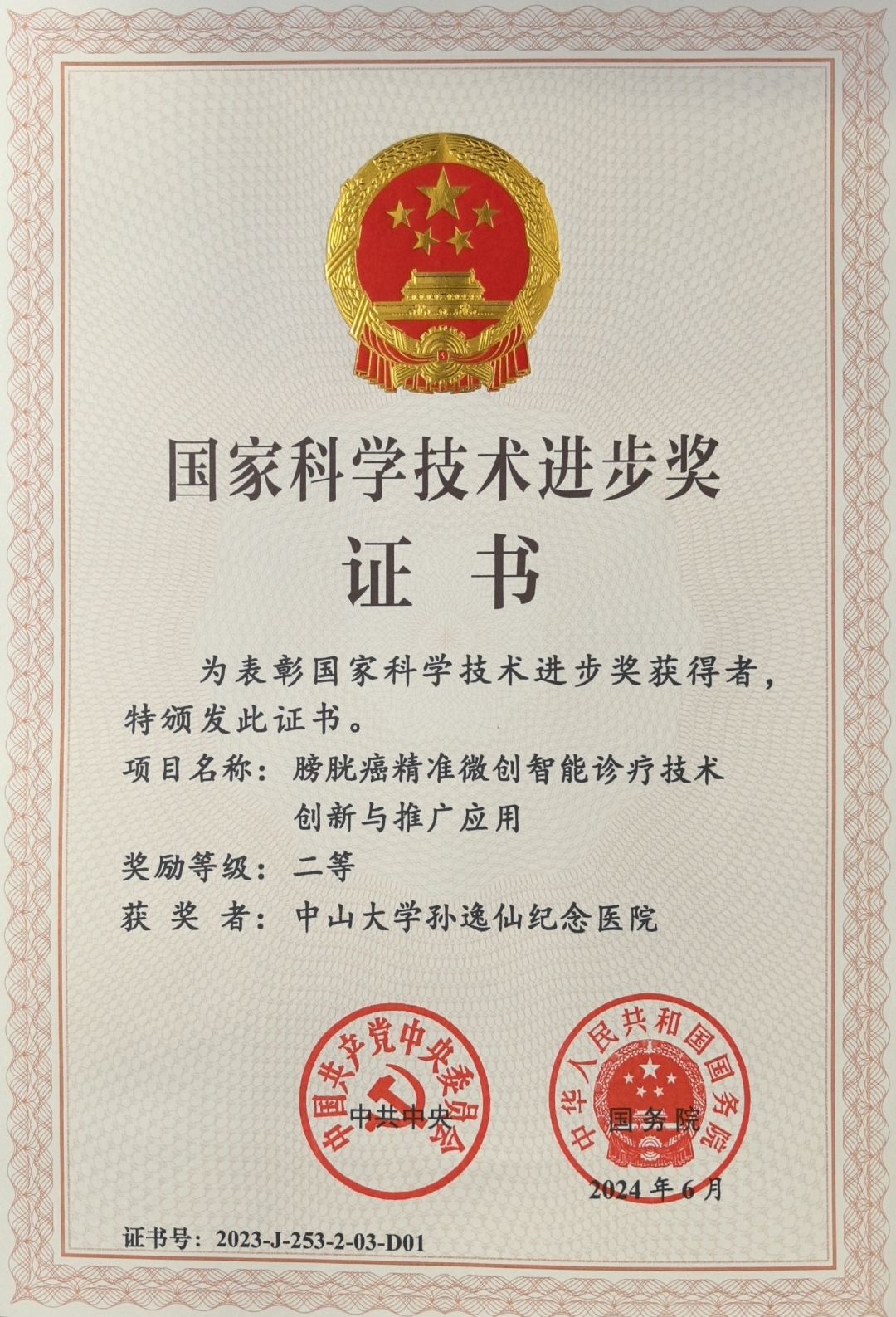 6月24日上午,全国科技大会、国家科学技术奖励大会、两院院士大会在北京人民大会堂隆重举行。以中山大学孙逸仙纪念医院为第一完成单位的科研成果——“膀胱癌精准微创智能诊疗技术创新与推广应用”项目荣获国家科学技术进步奖二等奖。