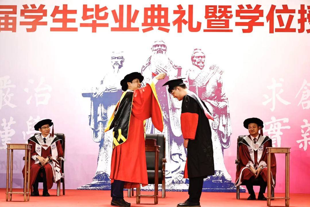 华南师范大学党委副书记、校长杨中民以“奋力书写为中国式现代化挺膺担当的青春篇章”为题,为全体毕业生送上最后一堂意蕴深远、情感真挚的“校长思政课”。他回顾了同学们这几年的校园生活和成长历程,并将红、蓝、绿“三色锦囊”赠予全体毕业生。