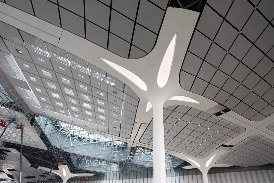 一期站房屋盖重超8000吨,支撑柱之间最大跨度达96米。为保证结构稳固,项目团队通过数十次受力模拟,把支撑柱深化为“榕树”造型,立柱通过延展的“树枝”形成反顶之力,擎举起整个屋盖。为进一步强化结构受力安全,团队研发了全国首例建构一体化树状造型钢结构柱施工技术,立柱的钢结构表面仅用外贴钢板作简装处理。候车大厅内,16根树状柱“枝叶相连”,外贴约4000片双曲不锈钢板,这些钢板不仅具有装饰功能,与立柱结合呈现“榕树”造型的蓬勃姿态,其本身也是车站整体结构受力的一部分。中铁建设项目团队选取铝板、汽车制造特种钢等5种实体样板进行实验比对,最终选定3毫米厚航空级异形双曲不锈钢,该材料具有良好的耐热耐蚀性、延展性,材料强度也能满足结构受力要求。
