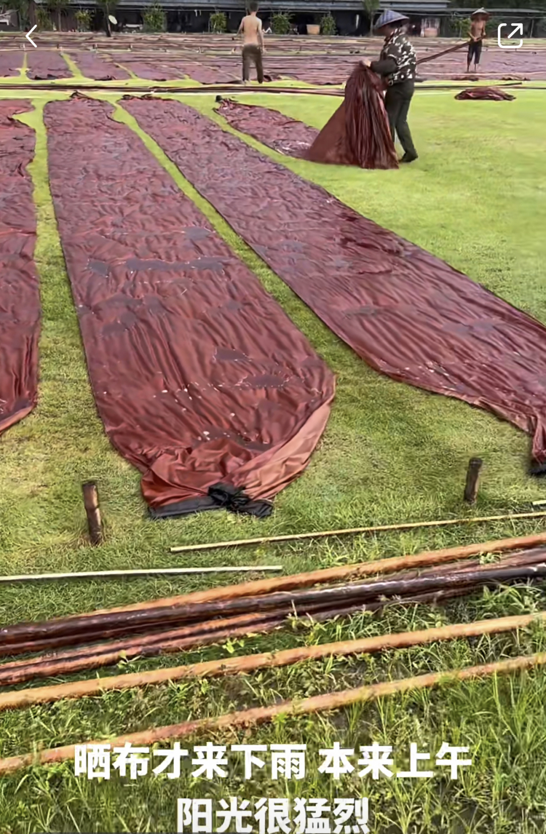 “晒布才来下雨,本来上午阳光很猛烈,晒场就开始晒布,可是没过多久就变天了。”香云纱生产厂家的员工发的视频中,可以看到突如其来的大雨让晒莨师傅都来不及将布收起来,就已经被雨水淋透。“这些被雨水打湿了的香云纱,需要重新收回去泡薯莨水。”该员工解释,如果淋湿后不重新泡薯莨水,会对品质产生很大影响,因此做一匹香云纱也需要“看天吃饭”。