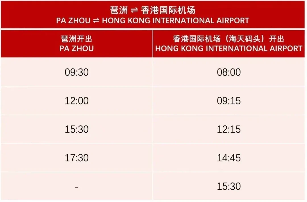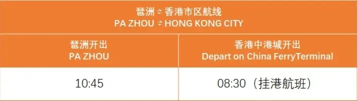 目前,琶洲港澳口岸到香港的航线有:广州琶洲港-香港国际机场海天客运码头、广州琶洲港-香港中国客运码头(中港城)。