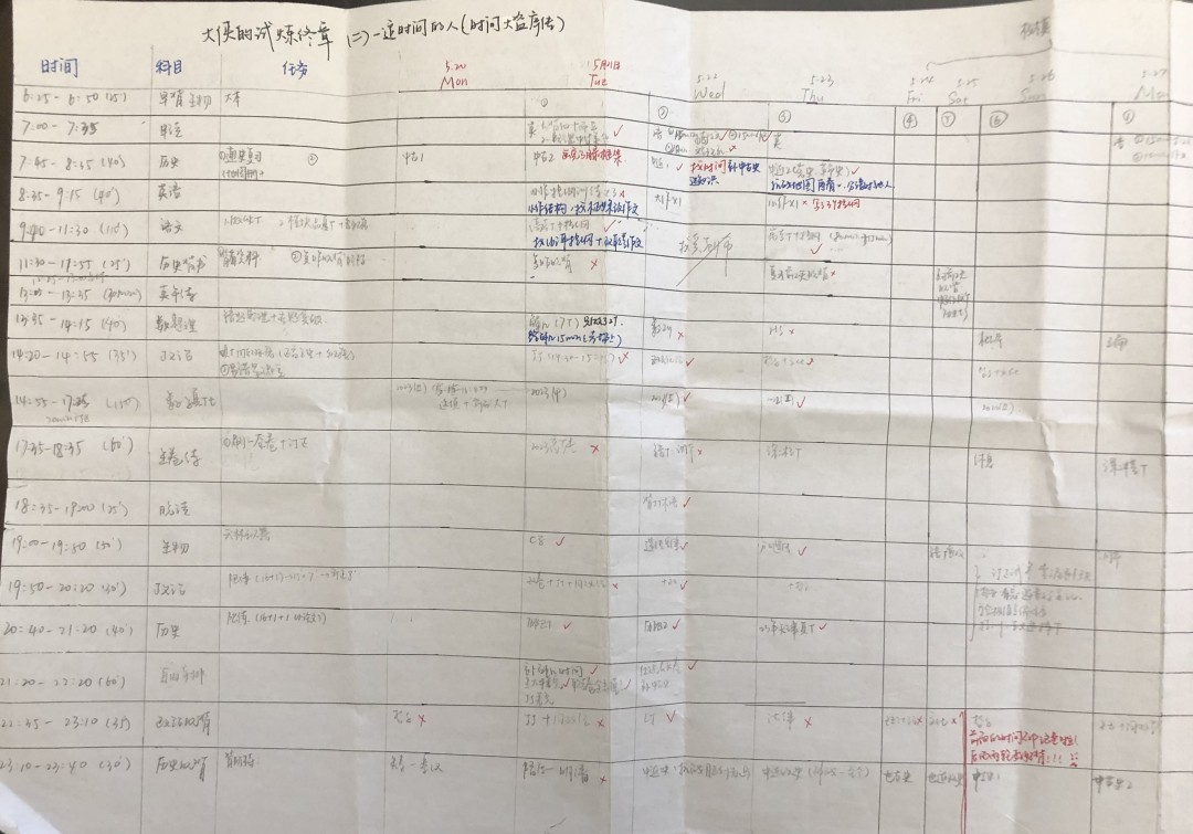 谈及学习经验时,吴泳欣特别提到了做计划的重要性。在每个复习阶段,她会列出一张详细的计划表,确定最重要的复习内容,按着节奏走,让每天都很充实,专注度很高。广州日报记者从吴泳欣的计划表中看到,她会计划细化到每天甚至具体时间点,除了具体复习任务外,她还明确复习要解决的问题,做到总结与反思。不过,吴泳欣坦言,在实践中她并不能完成所有的计划,“及时调整计划的能力可能比做计划更重要”。