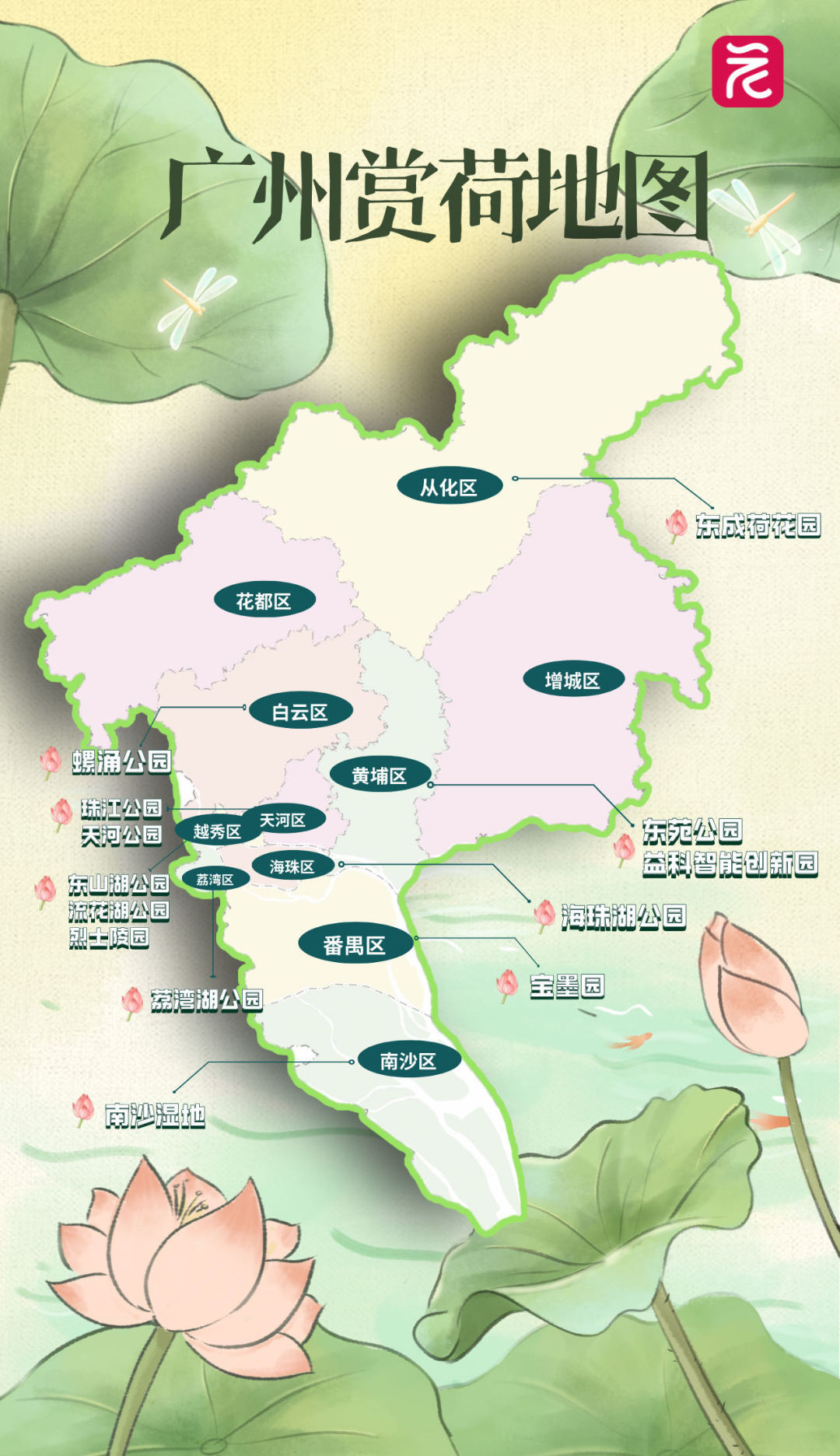 【荷花正盛夏!广州赏荷地图来了】在广州流花湖公园、荔湾湖公园、白云区螺涌公园等处,一池池荷花竞相绽放,微风拂过摇曳生姿,满池叠翠美不胜收。为大家准备了一份广州赏荷地图,去赴一场夏天的约会!详情>>