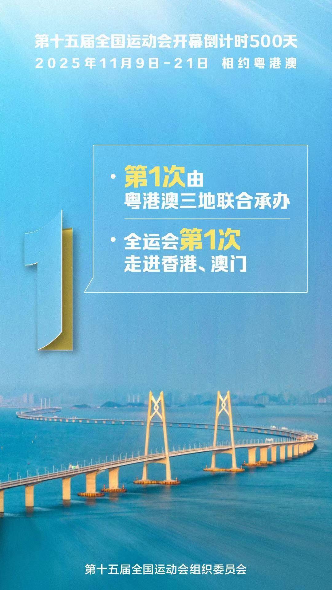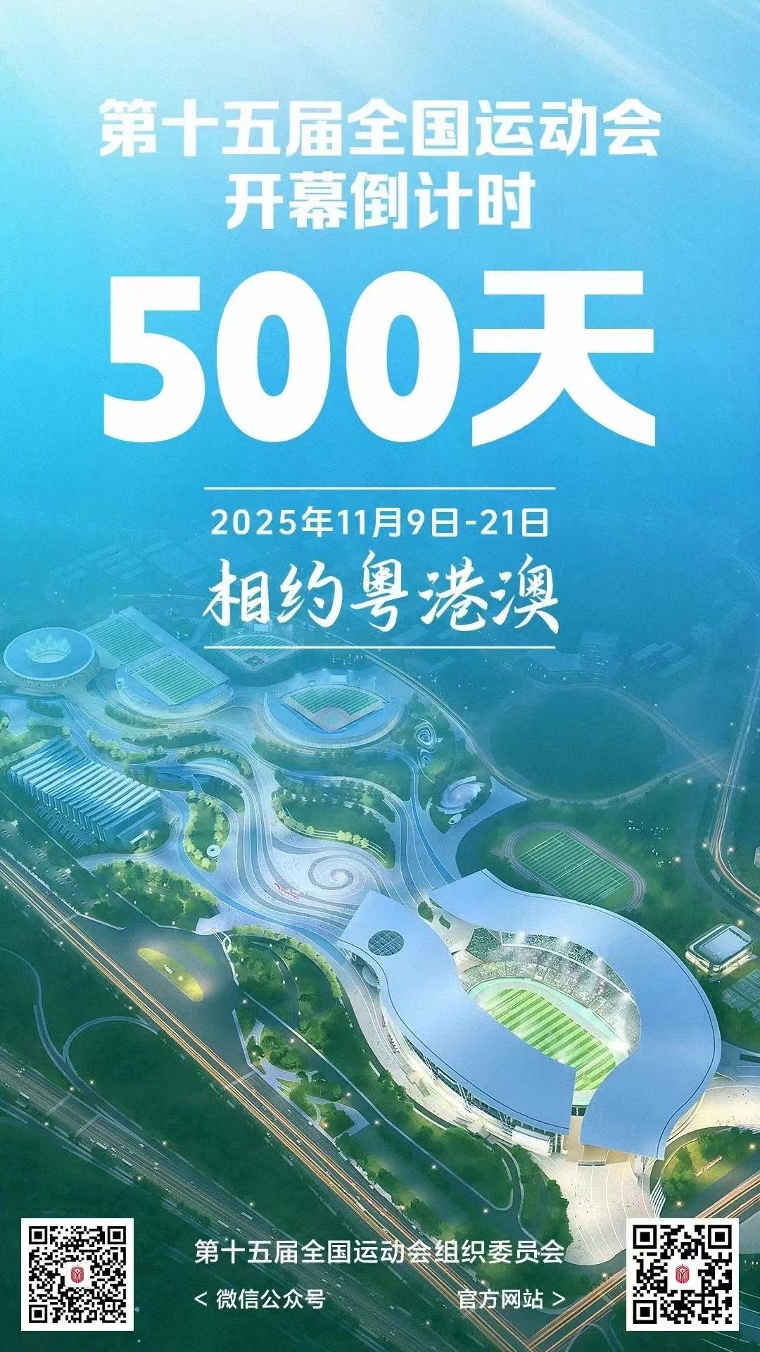 距离第十五届全国运动会开幕还有500天!2025年11月9日-21日,让我们相约粤港澳一起见证这场全国最高规格的体育赛事!