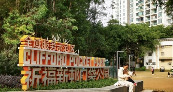 口袋公园建设是番禺区政府大力推行的民生项目。番禺区城管局联合钟村街结合居民休闲活动需求,抓住全域服务治理试点契机,选取祈福新邨晋景路明月轩五街2号楼南侧绿化地块(与大夫山森林公园相通)约4300平方米改造建设全域服务示范区祈福新村口袋公园,区城管局统筹财政资金约75万元,联同钟村街、祈福集团部署推进设计施工,于2023年底建成完工。