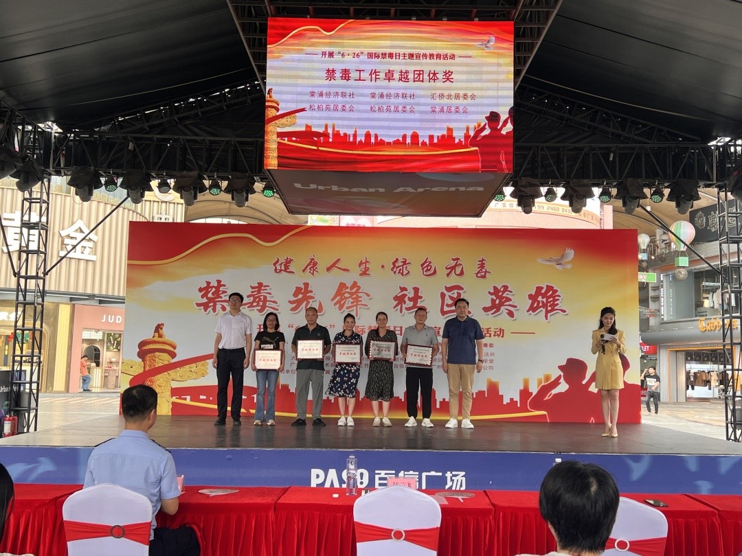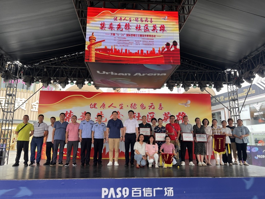 6月26日,广州市白云区新市街禁毒委联合广东省第四强制隔离戒毒所、新市街团工委、新市派出所、新市司法所、大同社会工作服务中心广州新市站点、广州市文化艺术名家黄俊英工作室和新市商会,在百信广场共同开展“禁毒先锋,社区英雄”禁毒日主题活动,致敬无私奉献、勇往直前的禁毒英雄们,向他们送上节日问候,表彰他们的无畏和坚定,为社会的安宁筑起坚固的防线。