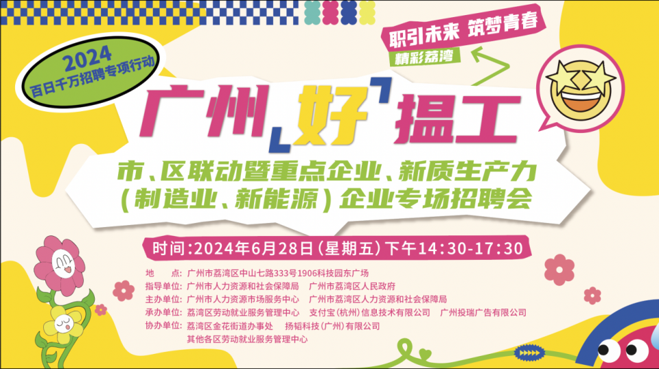 其中,首场活动“广州好搵工-精彩荔湾”市、区联动暨重点企业、新质生产力(制造业、新能源)企业专场招聘会将于2024年6月28日(星期五)下午14:30-17:30在荔湾区中山七路333号1906科技园东广场启动,现场将迎来荔湾、白云、海珠、黄埔、番禺等多个区智能制造、商业服务、批发零售、交通运输、教育培训等行业的30多家优质企业参会,提供1380多个就业岗位。