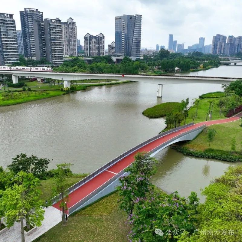 其中,南沙区蕉门河依托原生植物体系与碧道系统,构建“绿色海绵”城市,利用植物、湿地、园路、构筑物等打造了公园景观系统,为周边社区提供休闲绿道、游乐园和雨水花园,成功打造都市型高标准休闲观光风情带,完美蜕变为“城市客厅”。