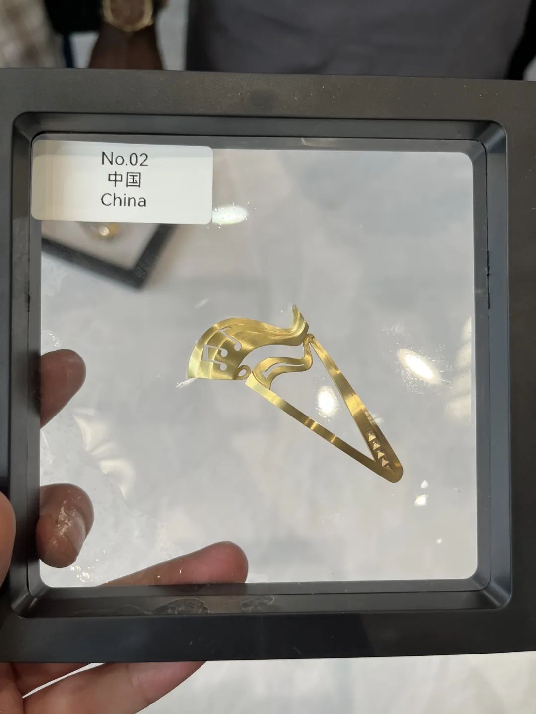李来戈和小南说起此次大赛的有趣记忆,这次的珠宝加工题目妙趣横生,项目题目为《爱乐之城》,每名选手需要凭借一套专业的珠宝加工工具,手动加工,让18k金质板材蜕变为竖琴状立体的“一带一路”标记作品。
