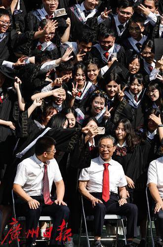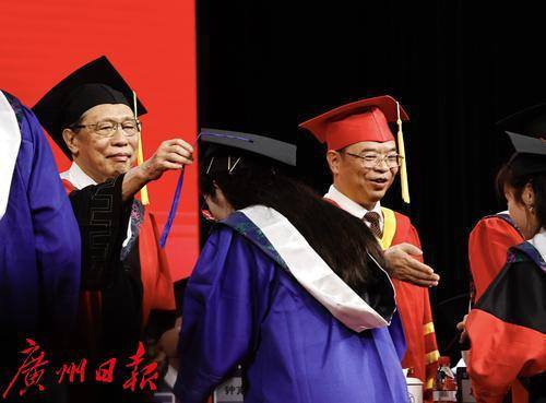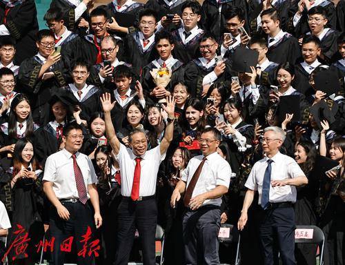 毕业典礼前钟南山院士与毕业生合影。典礼现场中,2024届毕业生带来了精彩动人的快闪表演。毕业生代表、教师代表、校友代表先后发言。“共和国勋章”获得者、中国工程院院士钟南山,广州医科大学校长赵醒村教授为毕业生寄语。典礼由广州医科大学党委书记唐小平主持。