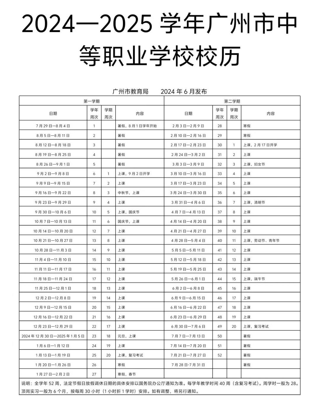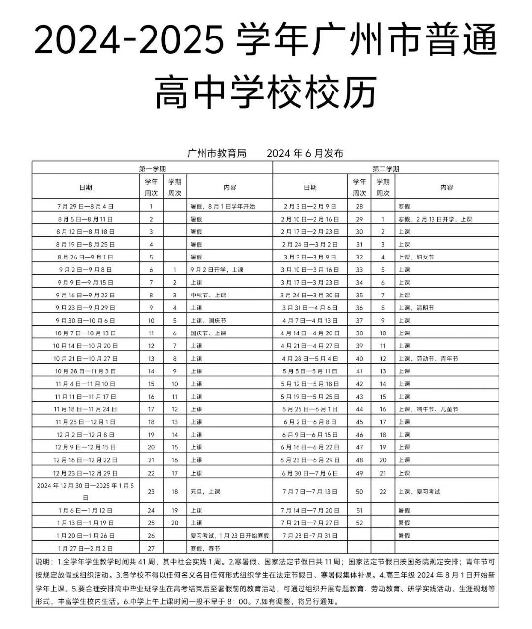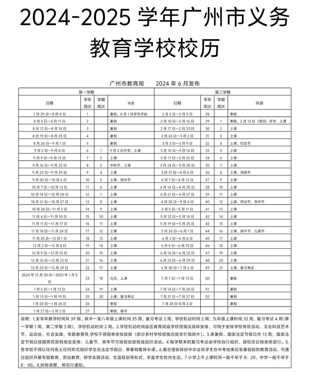 6月28日,广州市教育局发布《关于印发2024-2025学年普通中小学校校历的通知》(以下简称“《通知》1”)和《关于印发2024—2025学年广州市中等职业学校校历的通知》(以下简称“《通知》2”),公布《2024-2025学年广州市义务教育学校校历》《2024-2025学年广州市普通高中学校校历》和《2024—2025学年广州市中等职业学校校历》,明确中小学校和中职学校9月2日结束暑假正式开学,其中高三学生8月1日开始新学年上课,2025年2月13日(周四)结束寒假正式开学上课。