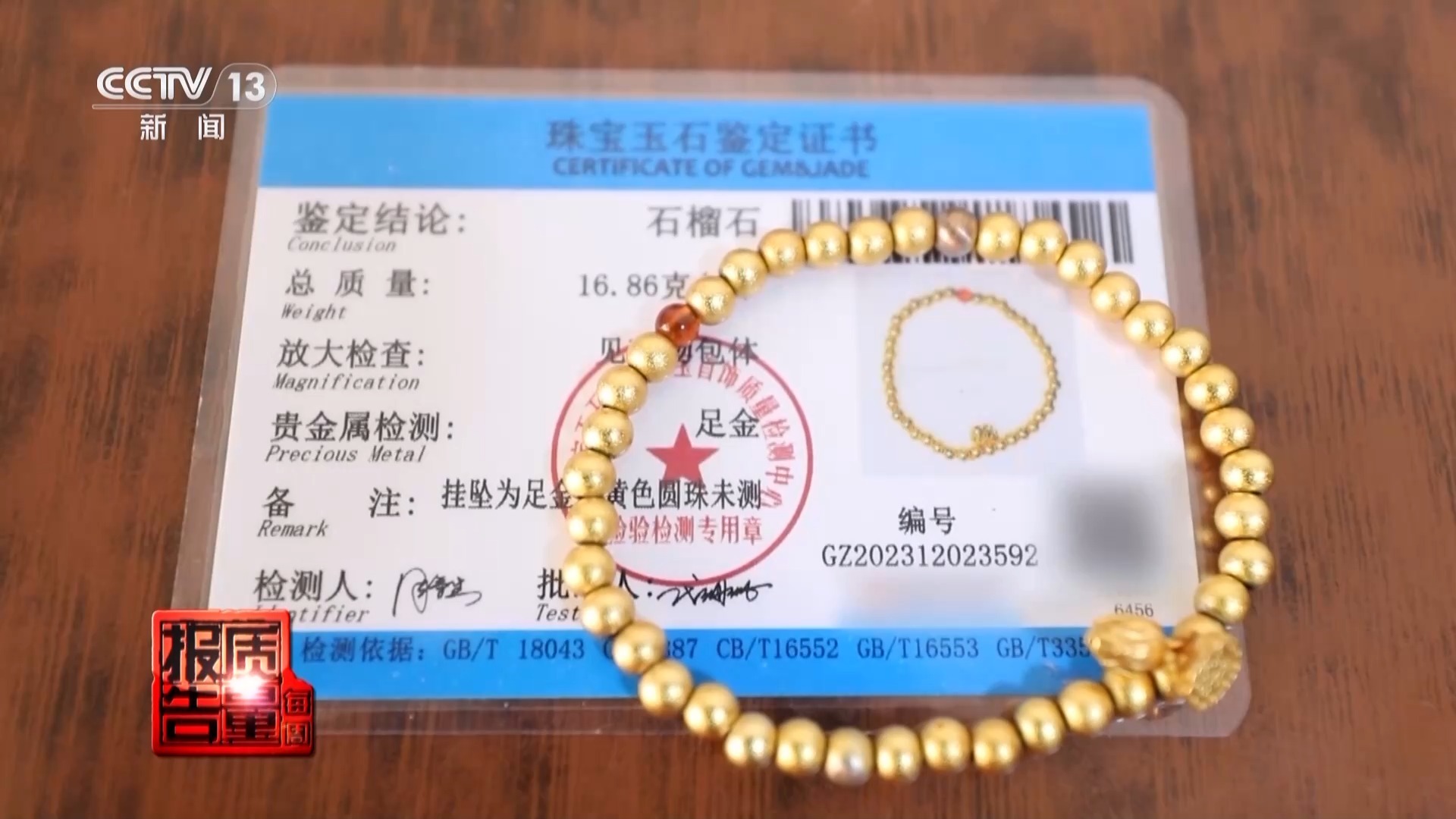 再看直播间商家提供的鉴定证书,检测主体为“石榴石”,贵金属检测为“足金”,备注位置写着“挂坠为足金,黄色圆珠未检测”。也就是说,商家寄来的这张证书是以手串上的石榴石为检测主体。