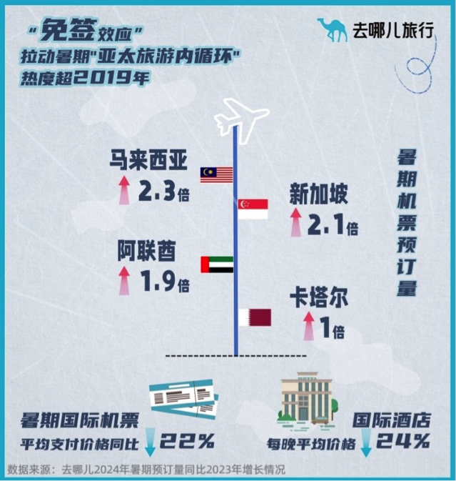 去哪儿大数据显示,截至目前,今年暑期国内机票平均支付价格比去年同期降低6%,中端酒店每晚均价降低8%,旅客提前预订周期变短。国际机票酒店价格同比也下降两成左右,叠加“免签效应”进一步带动部分国家出境游火爆,“亚太旅游内循环”趋势明显,马来西亚、新加坡暑期旅游市场火热程度预计将超2019年。
