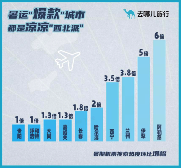 从今年暑运航班增班情况来看,国内西北地区干支线增班最多。如兰州/西安-嘉峪关、郑州-阿勒泰,南京-敦煌等。去哪儿大数据显示,暑运航空市场西北地区启动速度较快。除了新疆的伊犁、阿勒泰等地,兰州、西宁热度也开始上升;东北的哈尔滨、长春,山西的大同,甘肃的嘉峪关热度增加较快;内蒙古地区上升也较为明显。 这些城市也是国内暑期旅游市场的热门目的地。