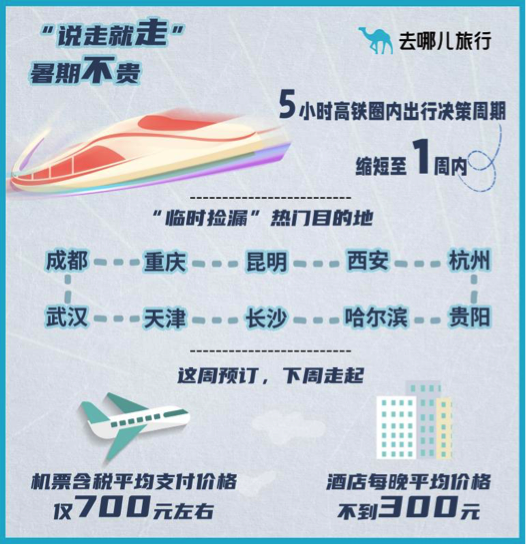 部分热门短途航线,即使在暑期,临时也能捡漏比较便宜的机票。去哪儿大数据显示,本周买票、下周出行的“说走就走”热门目的地包括成都、重庆、昆明、西安、杭州、贵阳、哈尔滨、长沙、天津、武汉。即便仅提前一周,飞往这些城市的机票含税平均支付价格也仅700元,酒店每晚平均价格不到300元。