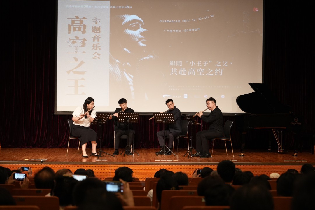 开幕式当天,广东外语外贸大学法语文学教授王牧,《小王子》爱好者陆慧刚,广东省作家协会会员木每,以及来自中国南方航空的乘务长赵真、飞行员马灿国共聚广图,分享他们的研究与热爱、职责与感悟;来自陈三庆室内乐团的演员们则用一场公益音乐会致敬“高空之王”圣-埃克苏佩里,以音符为媒介,带领听众感受作家浪漫壮怀的一生。