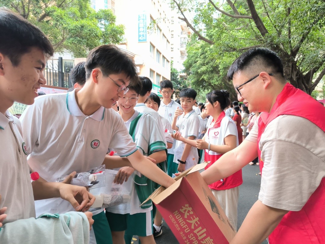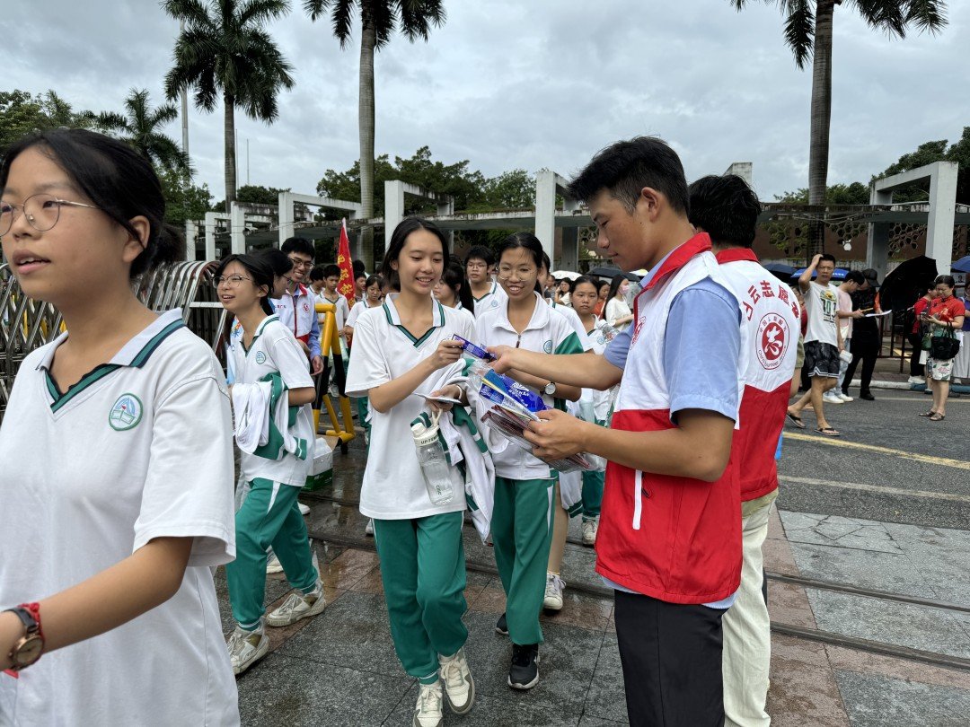 在多个考点外,志愿者们身穿醒目的志愿者红马甲,协助交警维护交通秩序,确保考生顺利进出考场。在助考志愿服务站点,青年志愿者们以爱心志愿摊位为阵地,为考生及家长提供贴心服务,发放免费考试文具包、饮用水、防暑降温药品和纸巾等必需品。还有考点设立了“心理健康助威区”——依托12355青少年服务台,志愿者们为考生进行心理疏导,同时向现场家长普及12355青少年心理健康求助热线,帮助家长缓解焦虑情绪。应急救援志愿者也携带专业救护装备,时刻为突发情况做好应急准备。